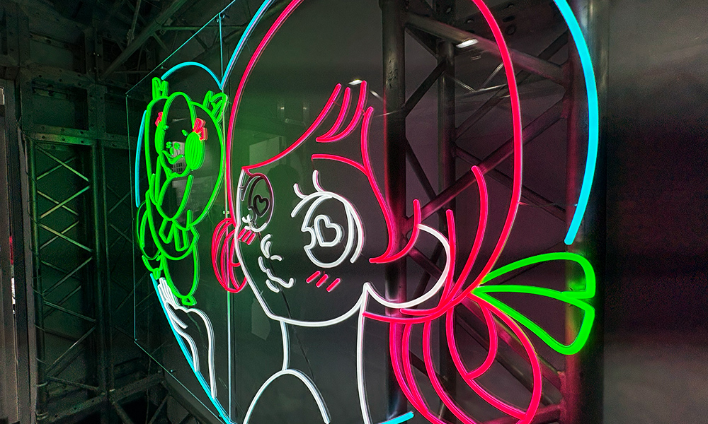 歌麿の「ビードロを吹く娘」をモチーフに、浮世絵からカワイイ文化、そして現代ポップまで──200年にわたる“日本美の変遷”を一つの絵画にまとめ上げています。