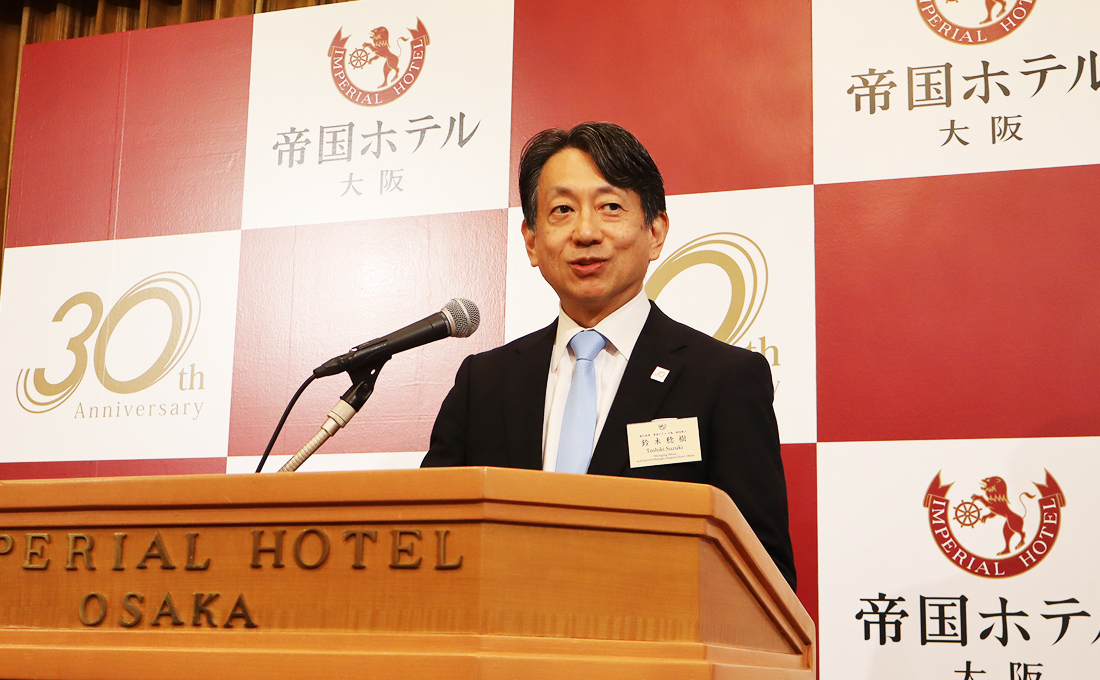 冒頭では、株式会社帝国ホテル 執行役員 大阪総支配人の鈴木稔樹氏が登壇し、1996年の開業から今日までの軌跡を振り返りながら、地域とともに歩んだ30年への感謝と、次の時代へ向けた決意を語りました。