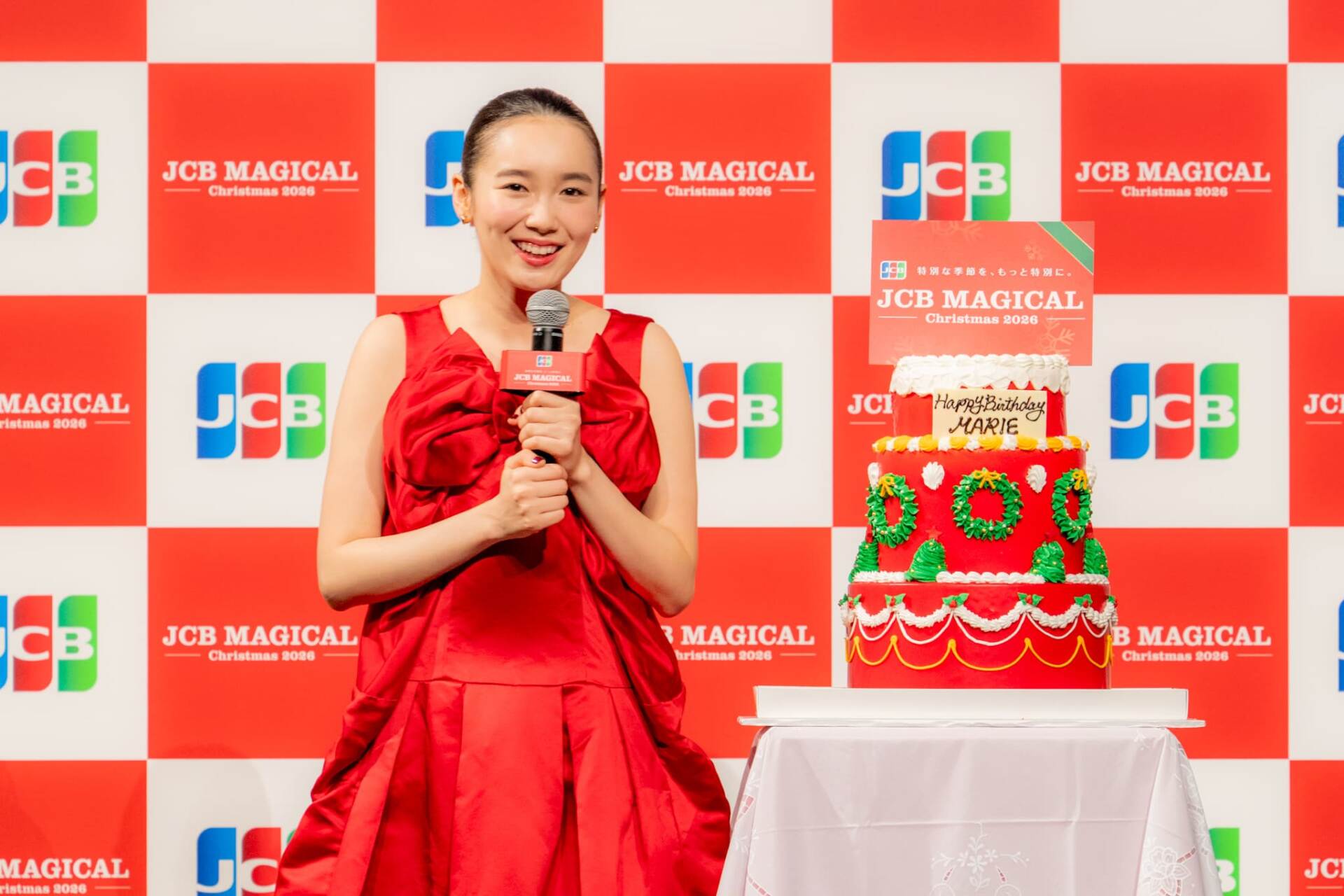 ここで、サンタクロースから飯豊さんへもう一つプレゼントが。2026 年1月5日にお誕生日を迎える飯豊さんに、一足早いお誕生日ケーキをクリスマス仕様で贈りました。サプライズプレゼントに驚いた様子の飯豊さん。28 歳になる新しい一年をどんな年にしたいか聞かれると「心がときめくことを大事にして過ごしていきたいです。新しいことにもたくさん積極的にチャレンジする年にしたいなと思います」と、力強く抱負を語りました。最後は「今日お話しさせていただいた『JCB マジカルクリスマス 2026』は、何気ないお買い物で気軽に参加できますし、本当にサンタさんからの贈り物と思えるような素敵なキャンペーンになっております。ぜひこれを機に参加していただいて、2026 年をワクワクして楽しく過ごしていただけたらと思います」と、笑顔でメッセージを送りました。