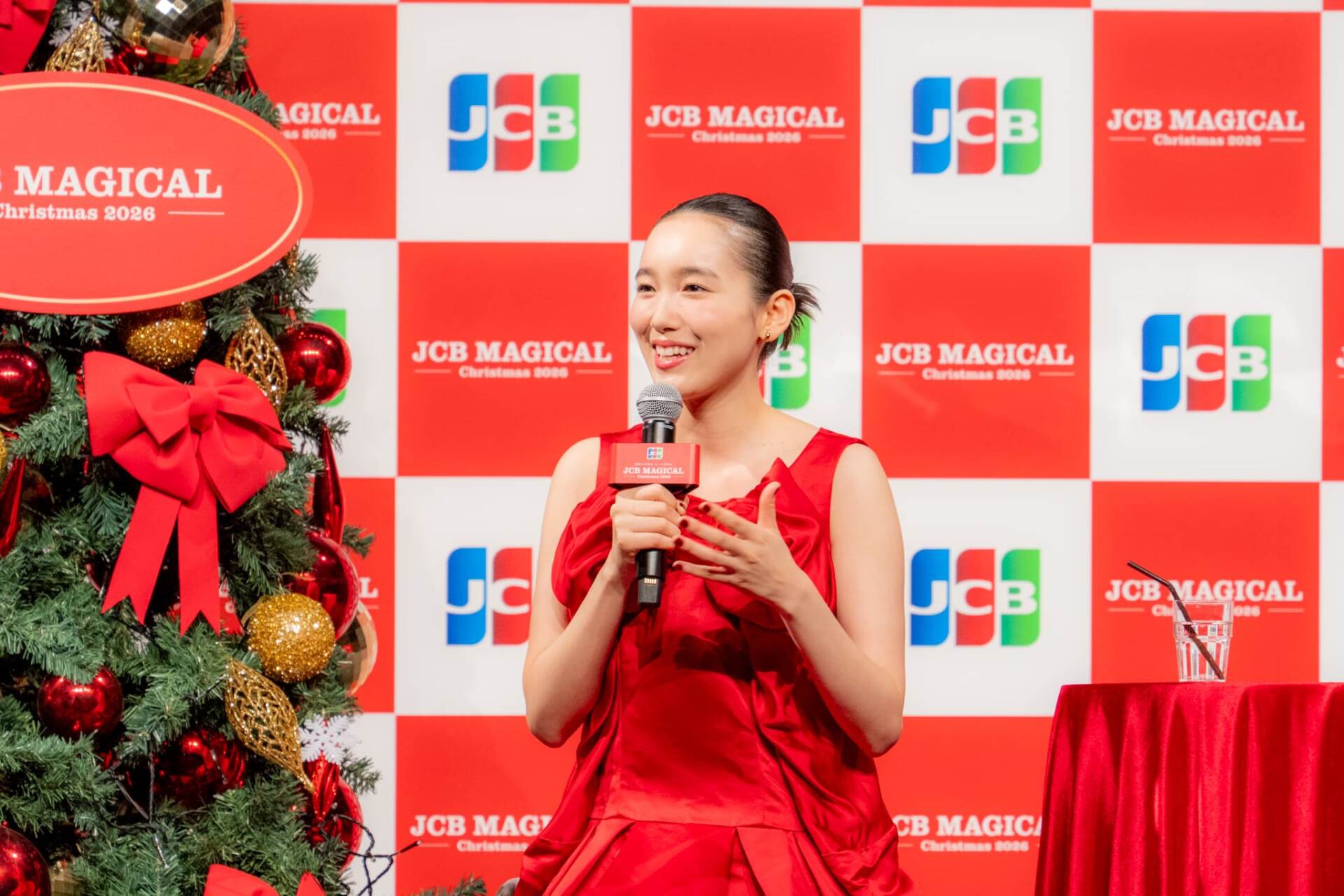 MC の呼び込みで、飯豊まりえさんが登場。「JCB マジカル クリスマス 2026」のキャンペーンカラーであり、クリスマスという日にもぴったりの華やかな赤いドレスで登壇した飯豊さんは「皆さん、メリークリスマス!飯豊まりえです。本日はよろしくお願いします」と笑顔で挨拶をしました。