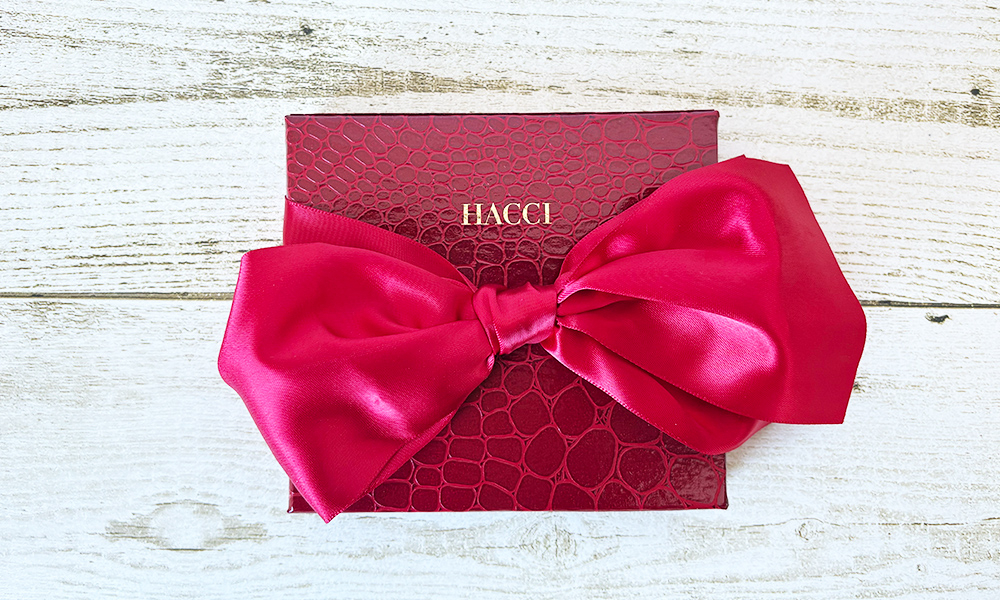 まず惹かれるのは「ギフト力」。クロコ柄×深紅リボンが、箱を開ける前から特別