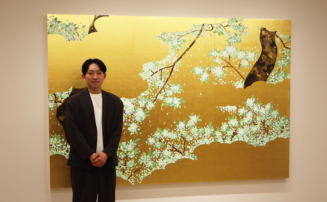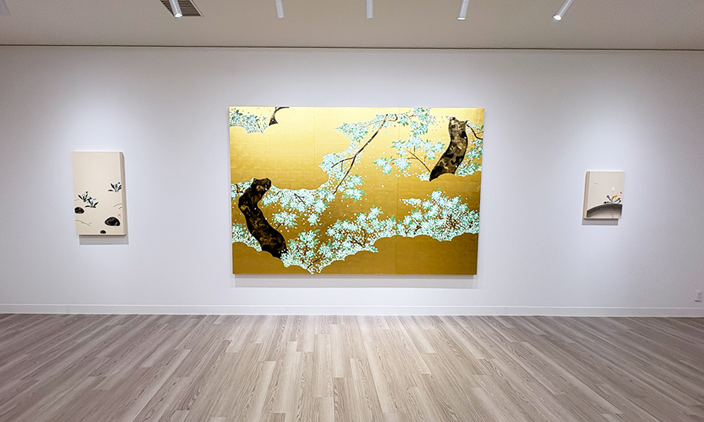 本展の中心作品は、大島桜を描いた大作「桜図」。室町時代から続く金・緑・白・黒の色彩構成をベースに、金箔の背景に浮かぶ白い花と緑の葉が鮮やかなコントラストを生み出しています。