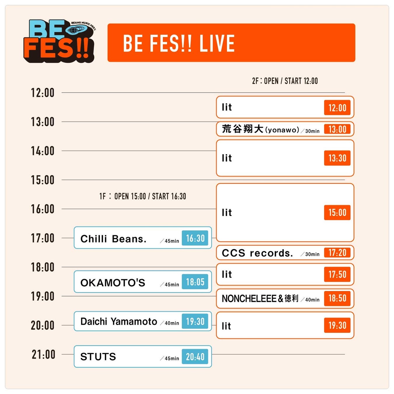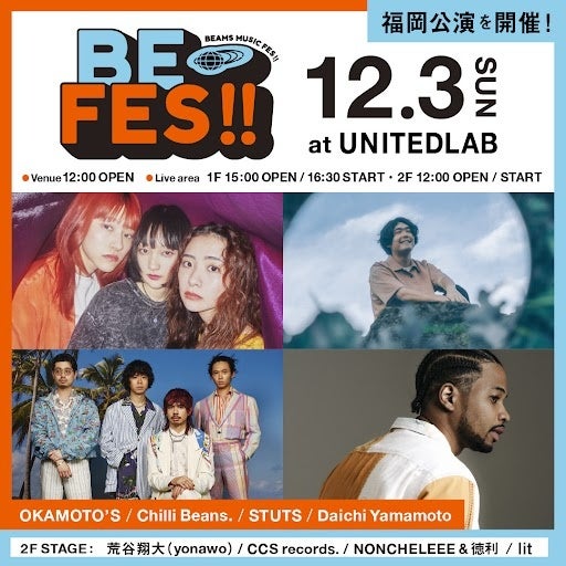 株式会社ビームス(本社:東京都渋谷区、代表取締役社長:設楽洋)は、2023年12月3日(日)、福岡県福岡市のエンターテイメント施設「UNITEDLAB」にて、 『BE FES!!』福岡公演を開催し、一般チケットが発売中です。2Fステージの出演者が決定し、1Fステージを含むタイムテーブルとともに、当日を盛り上げる会場内コンテンツを発表します。また2Fでは、福岡の飲食店の様々なフードが楽しめる『BE FES!! KITCHEN』や『BE FES!!』仕様のオリジナルフォトが撮れる『BE FES!! FILM』、『BE FES!!』2Fステージ出演アーティストやインフルエンサーによるフリーマーケット『BE FES!! & FRIENDS FLEA  MARKET』、福岡で活躍するアーティスト〈NONCHELEEE〉氏による似顔絵イベントや〈Toyameg〉氏による描き下ろしの2Fステージ背景&フォトブースを設置など多彩なコンテンツを用意します。さらに、OKAMOTO’S、Chilli Beans.、STUTSのサインTシャツが当たるプレゼントキャンペーンを実施します。