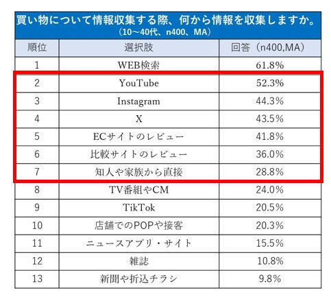 ・WEB検索だけで完結せず、YouTubeやSNSが多く併用されており、web検索,SNS,Youtube,ECサイトのレビューなど、複数のプラットフォームを行き来しなが“納得できる”情報を集めることが多い。