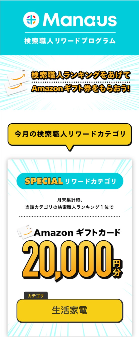 Mana-usでは検索職人リワードプログラムを実施中!「今月のリワードカテゴリ」の検索職人ランキング1位の検索職人ユーザー様にAmazonギフト1万円分を毎月プレゼントしています。