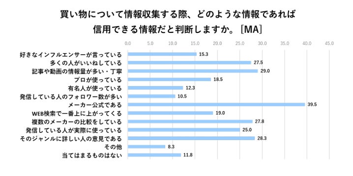 買い物について情報を収集する際に、どのような情報を参考にしますか?という問いに対して、ランキング形式の情報が最も高く、54.0%の結果になりました。また、WEB検索において、検索結果の上位いくつくらいまでみますか。という問いに対して、3つ目くらいまで、と回答した人が最も多く、35.6%という結果になりました。さらに、どのような情報であれば信用できる情報だと判断しますか。という問いに、口コミ以外にも、「そのジャンルに詳しい人の意見である」「記事や動画の情報量が多く丁寧」「多くの人がいいねしている」「発信している人が実際に使っている」などのスコアが高い傾向がありました。