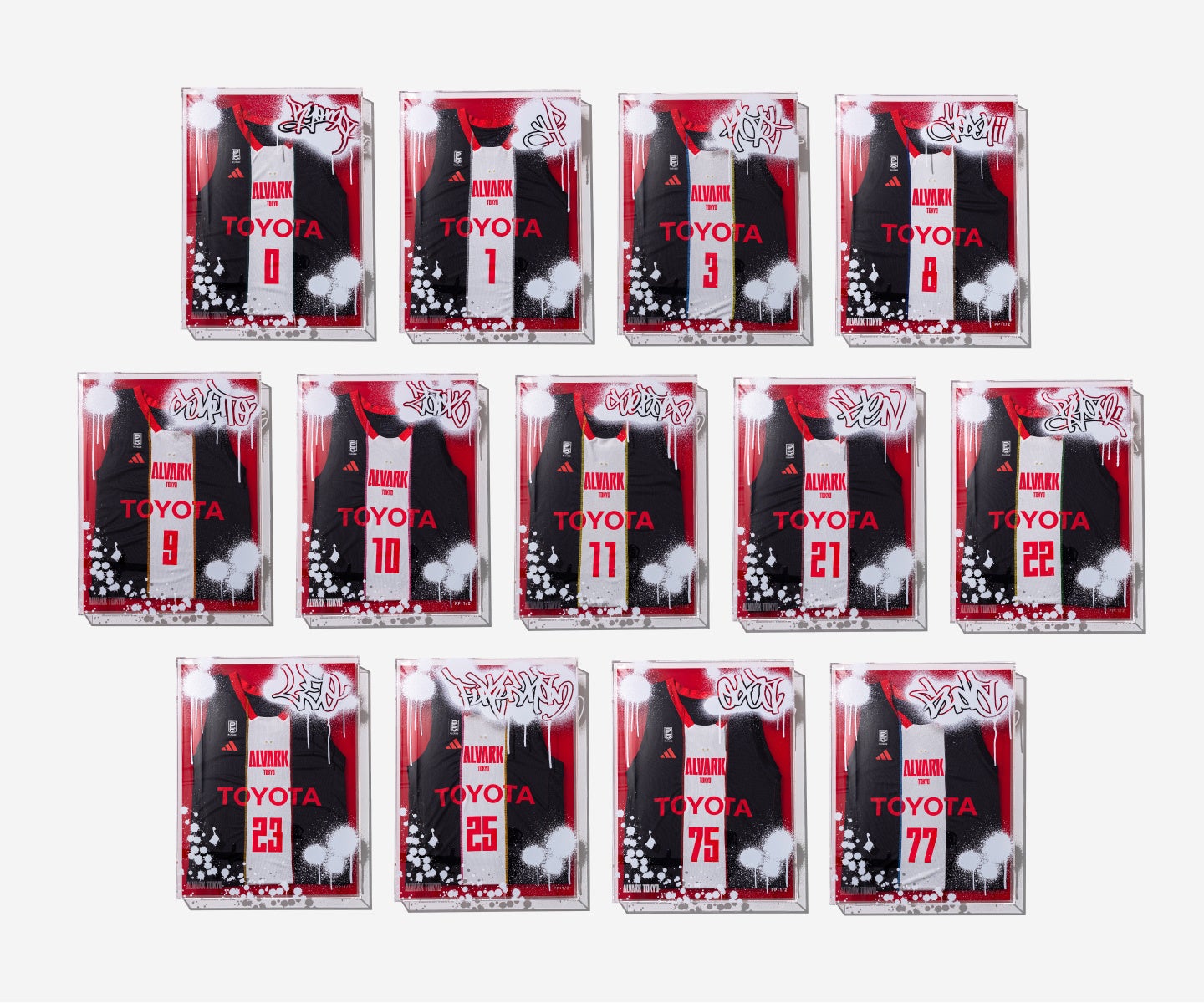 〈BEAMS SPORTS〉とアルバルク東京とアディダスの今回の共同企画は、2023-24シーズンにいくつもの試合を戦う選手の想いや観客の声援が詰まったユニフォームにフォーカスしました。13名の選手が試合で着用したホームとアウェイのユニフォームを裁断し組み替えたのちに選手自らが選んだ糸によって縫製し、唯一無二のユニフォームに仕上げています。またシリアルナンバー入りの額装には、選手の名前をグラフィティ風に施し、東京のストリートカルチャーやバスケットボールのスピード感を表現しました。試合を共に戦った証となるユニフォームに、リメイクという同じ物が2つとして存在しない特別感を加えアートとして昇華させることで、競技用ウェアという枠を超えた新たなユニフォームの価値を創り出します。