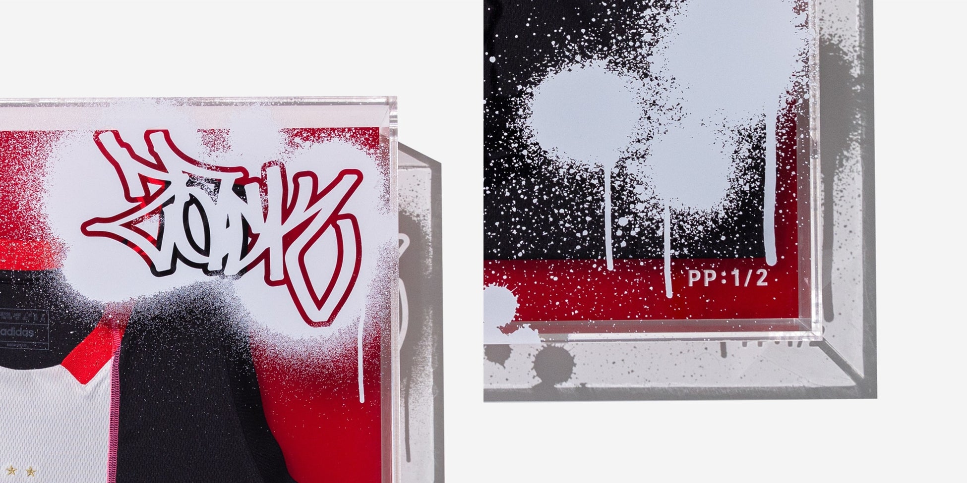 今回のプロジェクトでユニフォームを選択したのは、選手とファンを繋ぐ“絆”の象徴だと感じたからです。しかし、そのユニフォームもシーズンが終われば、新しいデザインに生まれ変わってしまいます。この企画でリメイクの手法を採用し、1点物のアートピースへと昇華した理由は、それぞれに様々なエピソードがあるホームとアウェイを繋ぎ合わせることで、シーズンという長い戦いをひとつに紡ぐと同時に、元々特別な存在であるユニフォームに新たな価値を宿してアーカイブしたいという思いからでした。こうした理由から額装も厚みのあるアクリルにすることで、目には見えない熱量や思い出も閉じ込めています。